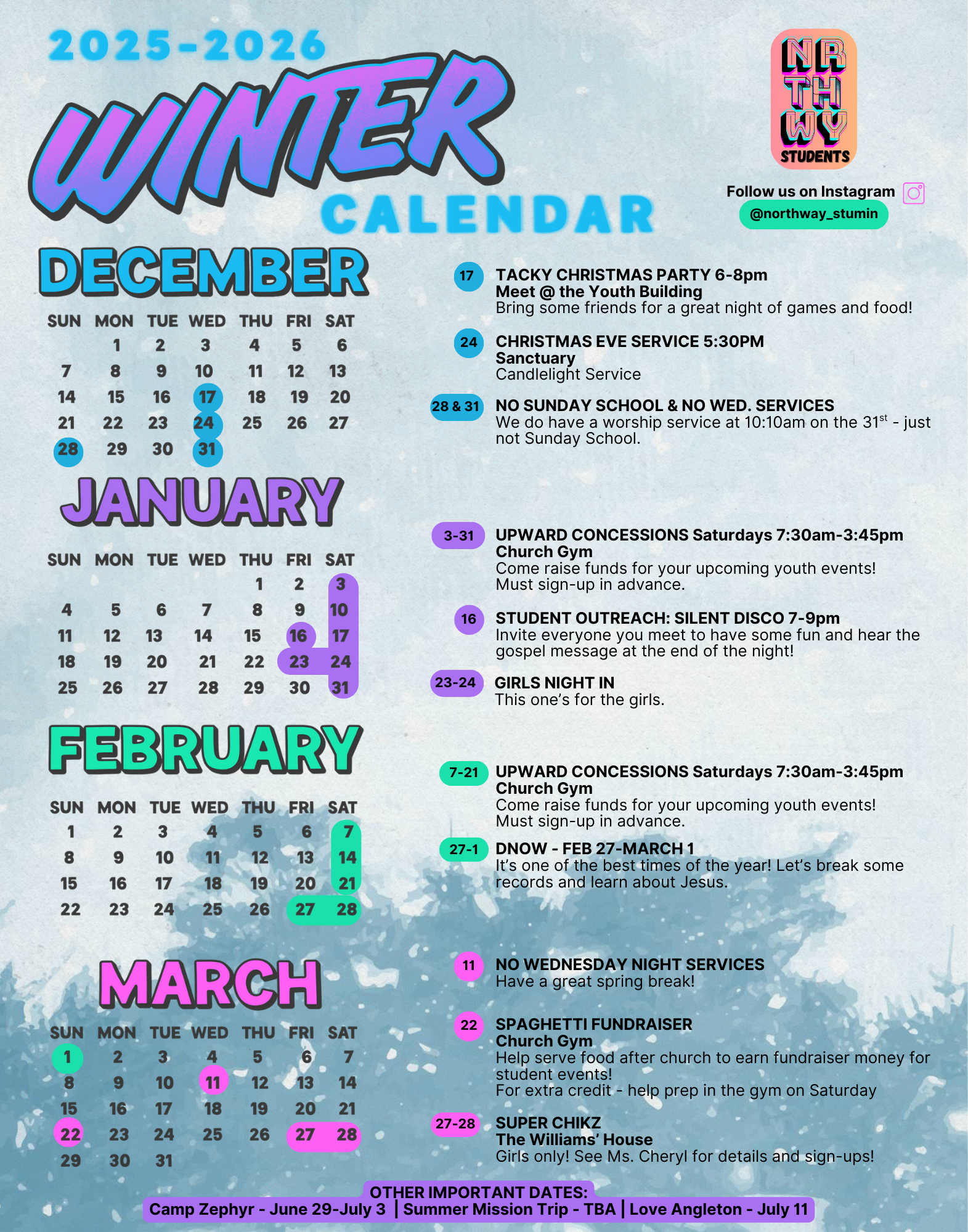 Welcome to DNOW, also known as Disciple Now! It’s an incredibly enjoyable in-house retreat where students from 6th to 12th grade are welcomed to spend a whole weekend at the church. We have a lively band, an inspiring speaker, and college-age small group leaders for our breakout sessions. On Saturday, we organize a large, exciting, and competitive game time that contributes to the team-based competition happening throughout the weekend. This year’s theme is Survivor (based on the famous game show)! This event is one that our students eagerly anticipate every year!